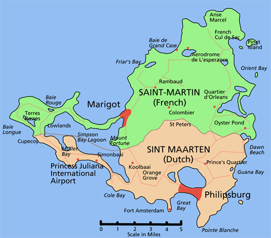 De totale oppervlakte van het eiland bedraagt 87 km². De totale lengte van de grens tussen het Nederlandse en het Franse deel van het eiland bedraagt 10 km. Er is vrij verkeer tussen beide eilandsdelen.